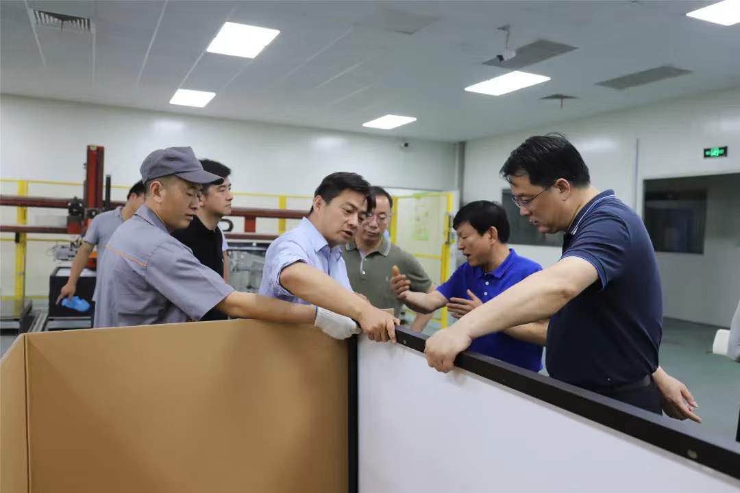 - 2020年6月4日上午10點(diǎn),市委副書記、市長張德軍,政府辦、統(tǒng)計(jì)局、經(jīng)發(fā)局等相關(guān)領(lǐng)導(dǎo)來我公司指導(dǎo)“雙過半”工作。太陽集團(tuán)董事長冷青松、綠能電力總經(jīng)理謝濤陪同,一行人參觀了綠能二期智能組件生產(chǎn)線,了解詢問產(chǎn)線的產(chǎn)能情況,并要求企業(yè)做好安全生產(chǎn)工作。