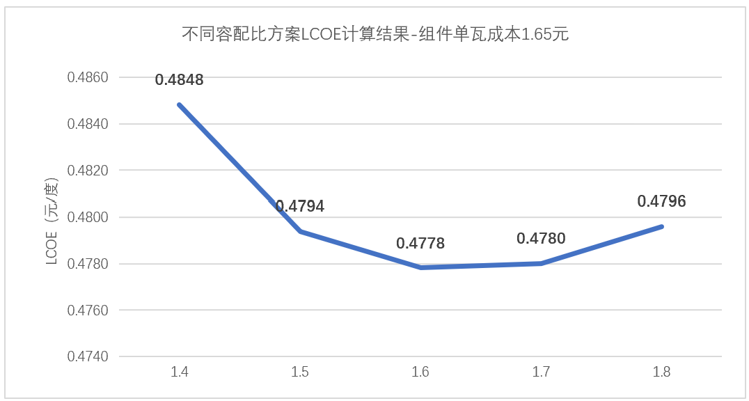 由第一幅圖可知,組件單瓦成本1.65元,LCOE最低時(shí)的容配比為1.6,即為最優(yōu)容配比。