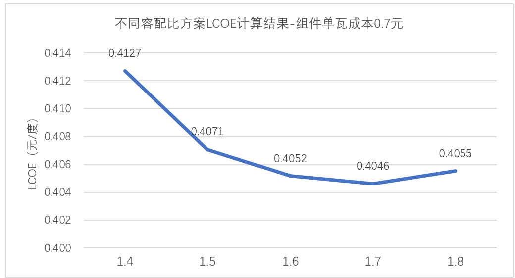 由第二幅圖可知,組件單瓦成本下降至1.35元時(shí),容配比1.6與1.7時(shí)的LCOE相同,此時(shí)最優(yōu)容配比為1.6或1.7。