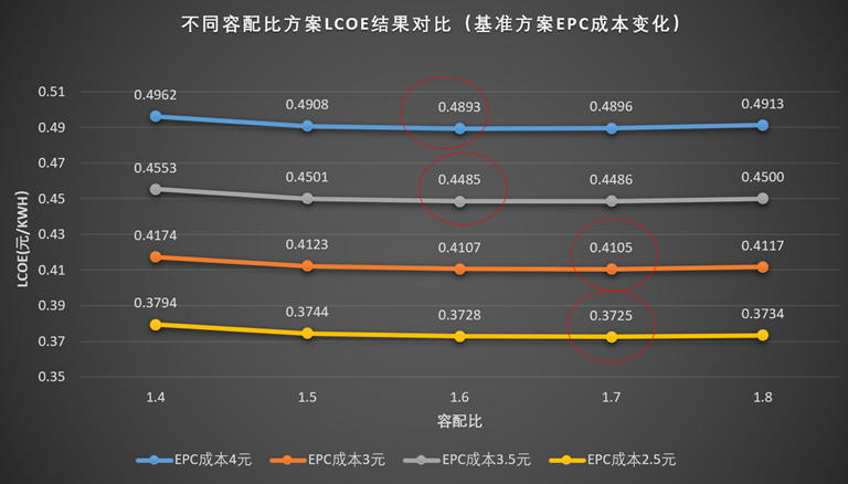 仍以上述合肥為例,例如下圖所示為EPC單瓦成本從4元下降至2.5元時(shí)的最優(yōu)容配比變化,EPC成本4元、3.5元時(shí)的最優(yōu)容配比為1.6,EPC成本至3元時(shí),最優(yōu)容配比為1.7。