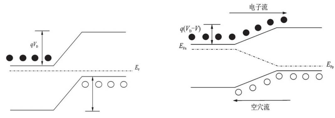 圖1.(a)平衡狀態(tài)下PN 結(jié)能帶;(b)正向偏壓下PN結(jié)能帶