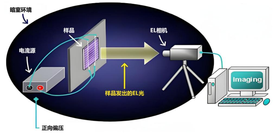 根據(jù)EL發(fā)光原理,當(dāng)給電池或組件施加正向偏壓時,會產(chǎn)生對應(yīng)的正向電流,進而激發(fā)EL現(xiàn)象。雖然理論上使用電壓注入與使用電流注入都能激發(fā)EL現(xiàn)象。但在實際操作中,由于不同電池技術(shù)、不同版型組件的工作電壓存在一定差異,這給EL批量測試帶來了很大的困難。因此,相較于電壓注入方式,電流注入方式更易于實現(xiàn)精確控制與批量測量,已被光伏行業(yè)廣泛接受并納入EL測試標準。
