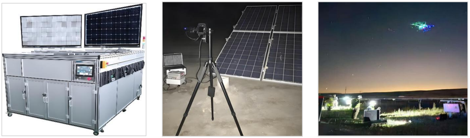 EL測試技術(shù)根據(jù)應(yīng)用環(huán)境分為室內(nèi)和戶外兩種。室內(nèi)EL測試通常在實驗室進行,如圖4(a)所示,該環(huán)境確保了穩(wěn)定的溫度、濕度和光照條件(符合行業(yè)標準),有助于分析光伏電池和組件的內(nèi)部缺陷,如斷柵、隱裂和同心圓等。室內(nèi)測試主要用于產(chǎn)品研發(fā)驗證、生產(chǎn)過程質(zhì)量控制、出廠前的全面檢測,以及故障分析與診斷,從而確保產(chǎn)品的性能和質(zhì)量。