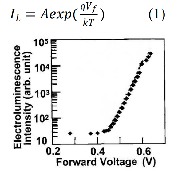 (1)電壓注入:正向偏壓Vf與EL光強正相關(guān),正向偏壓越大,EL光強越強,如公式(1)所示,其中IL是EL光強,A是常數(shù),q是電荷常數(shù),Vf是正向偏壓,k是玻爾茲曼常數(shù),T是環(huán)境溫度: