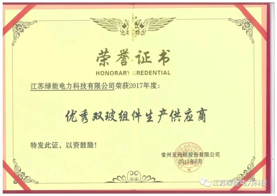 熱烈祝賀江蘇綠能電力科技有限公司(以下簡稱‘綠能電力’)榮獲常州亞瑪頓股份有限公司(以下簡稱‘亞瑪頓’)頒發(fā)的“2017年度優(yōu)秀雙玻組件生產(chǎn)供應(yīng)商”稱號!